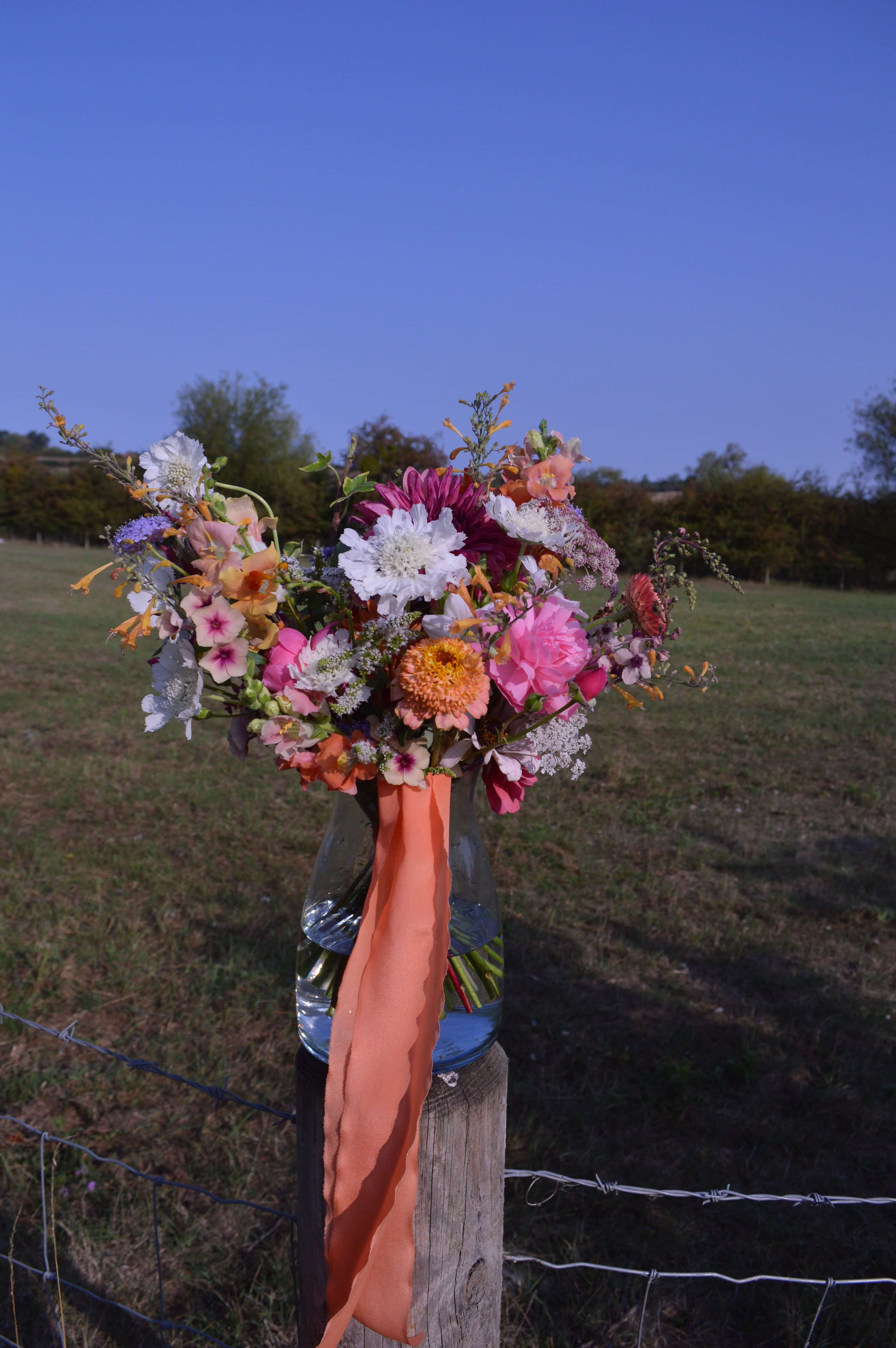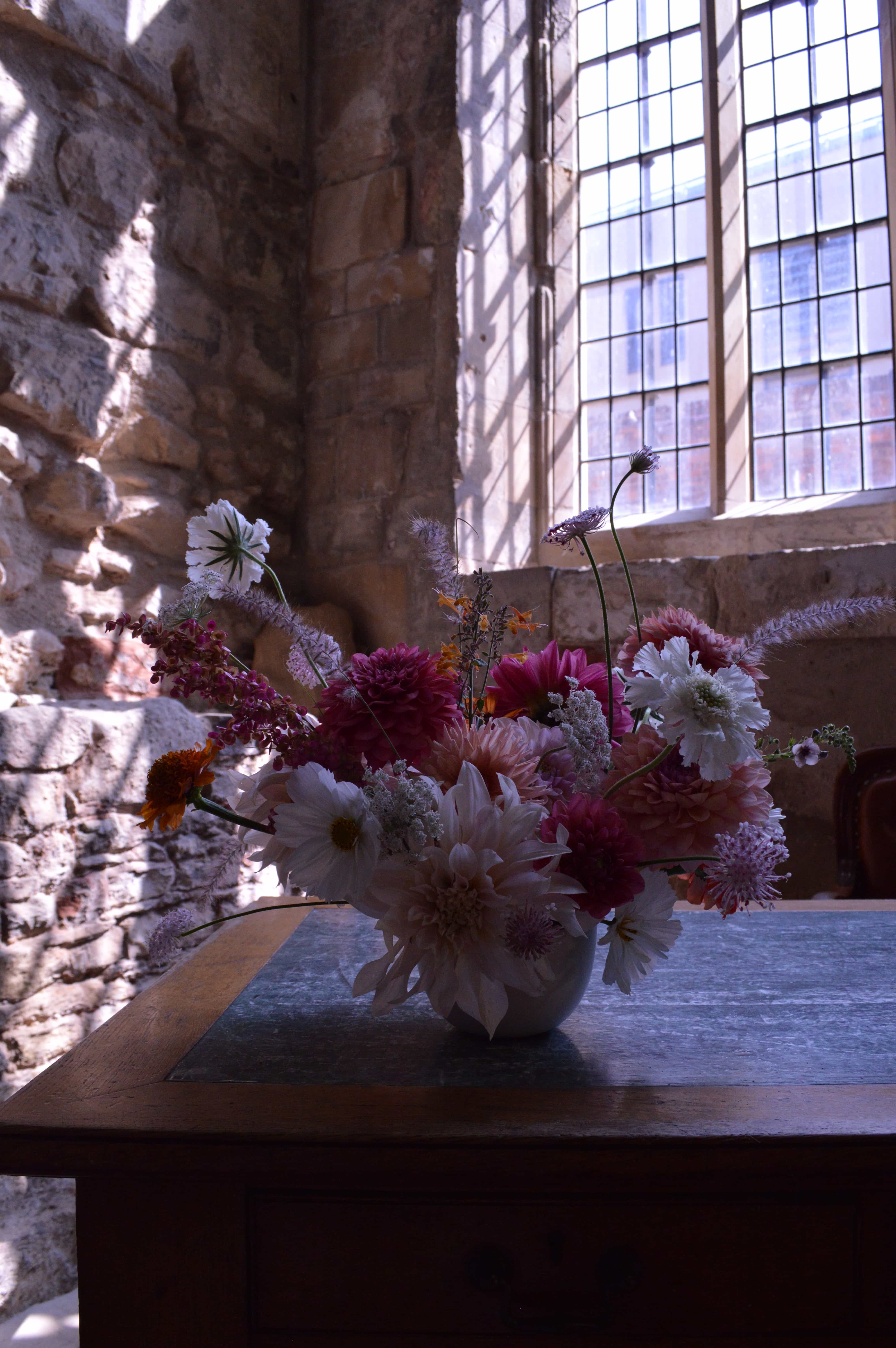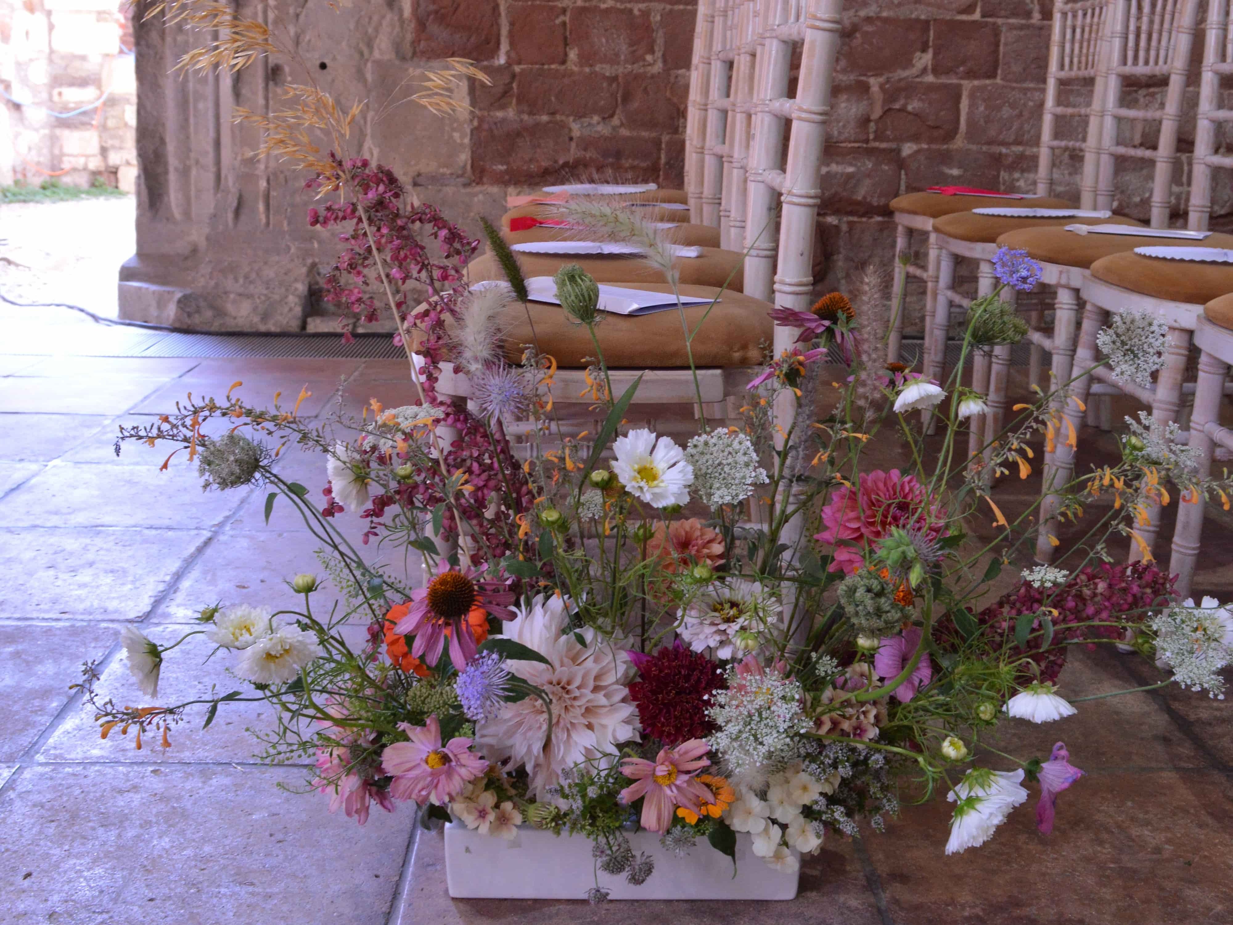 Opting for a bright colour palette that reflects their fun nature, Katie &Joe’s florals were inspired by a sunset colour palette with a strong focus on Joe’s favourite colour… orange! I designed aisle meadows to lead Katie to a statement installation in front of the beautiful fireplace, and the tables for the wedding breakfast filled with ikebana style bowls and orange-shaped vases for a bit of extra fun.